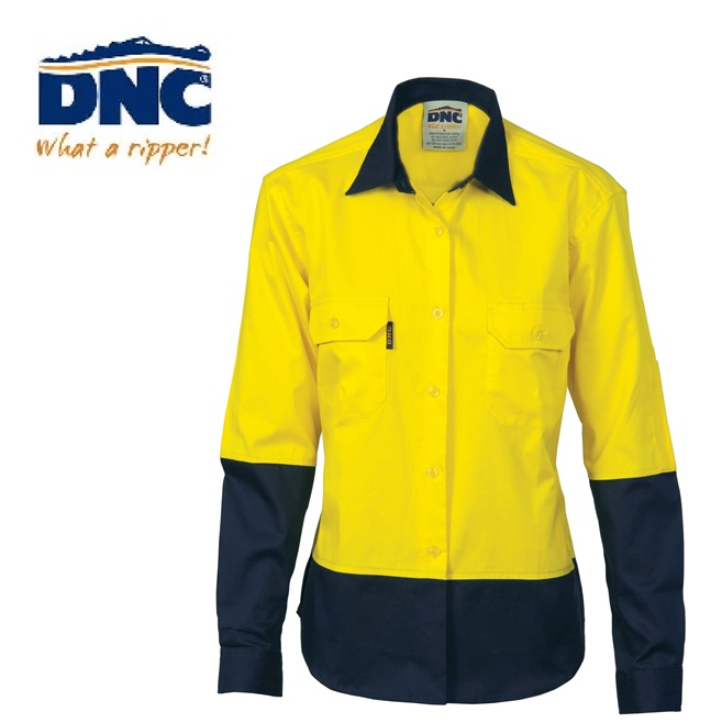 DNC- Ladies HiVis 2 Tone Cool-Breeze Cotton Shirt – Long Sleeve – (3940) Yellow/Navy or Orange/Navy